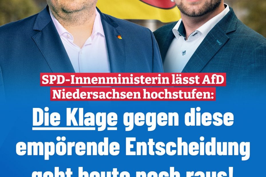 Die niedersächsische Innenministerin Daniela Behrens (SPD) gab heute bekannt, dass der Landesverband der AfD als „Beobachtungsobjekt von erheblicher Bedeutung“ eingestuft werde. Dazu Ansgar Schledde, Vorsitzender der AfD Niedersachsen: „Die Klage gegen diese empörende Entscheidung geht heute noch raus! Offensichtlich ist, dass dahinter politisches Kalkül steckt.… Weiterlesen »„Die Klage gegen diese empörende Entscheidung geht heute noch raus!“