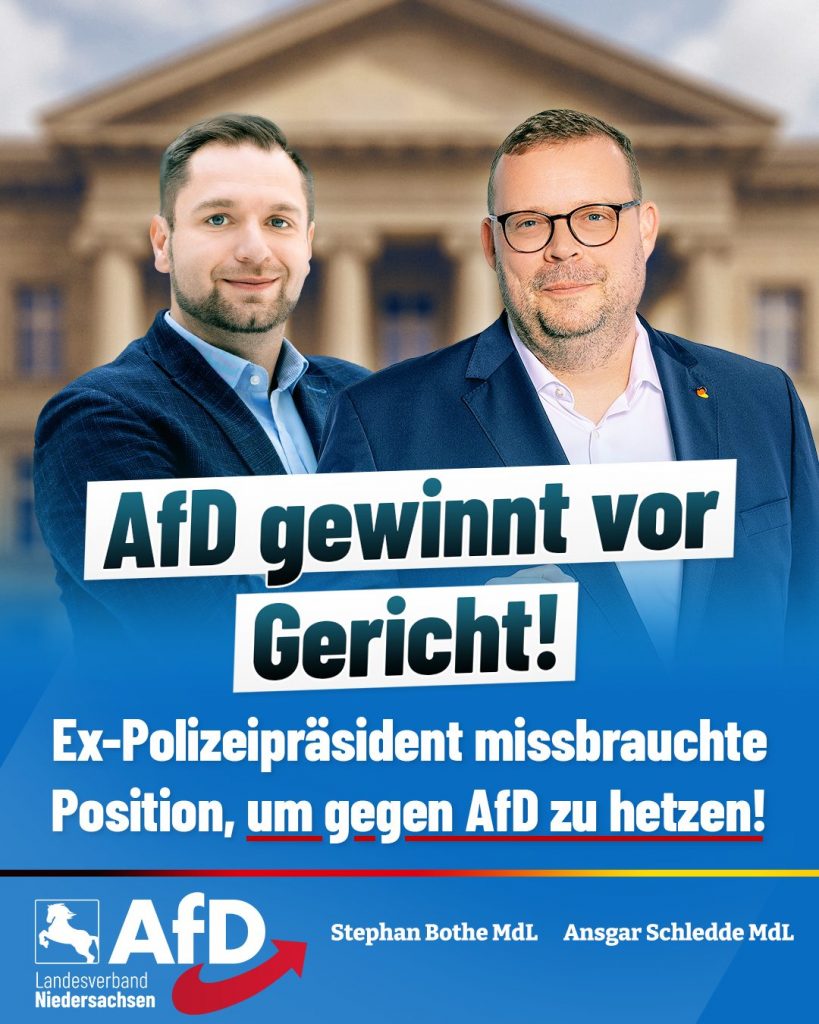 Johann Küh­me, damals Prä­si­dent der Poli­zei­di­rek­ti­on Olden­burg, hat der Nord­west-Zei­tung ein in gro­ßen Tei­len rechts­wid­ri­ges Inter­view gege­ben, so das heu­ti­ge Urteil der 1. Kam­mer des Ver­wal­tungs­ge­richts Olden­burg. Obwohl für Beam­te ein Gebot der Neu­tra­li­tät und Mäßi­gung gilt, hat­te er sich gegen­über der Zei­tung im Sep­tem­ber 2023 het­ze­risch zur AfD geäu­ßert und die Par­tei mit wahr­heits­wid­ri­gen Anschul­di­gun­gen über­häuft. Das Gericht gab der Poli­zei­di­rek­ti­on Olden­burg vier Wochen Zeit, die Aus­sa­gen Küh­mes rich­tig­zu­stel­len.