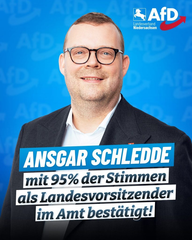 Die AfD Nie­der­sach­sen wählt heu­te auf ihrem Lan­des­par­tei­tag in Döt­lin­gen ihren Vor­stand neu. Zum Auf­takt wur­de Lan­des­chef Ans­gar Schled­de von den rund 150 Dele­gier­ten mit über 95% der Stim­men im Amt bestä­tigt: