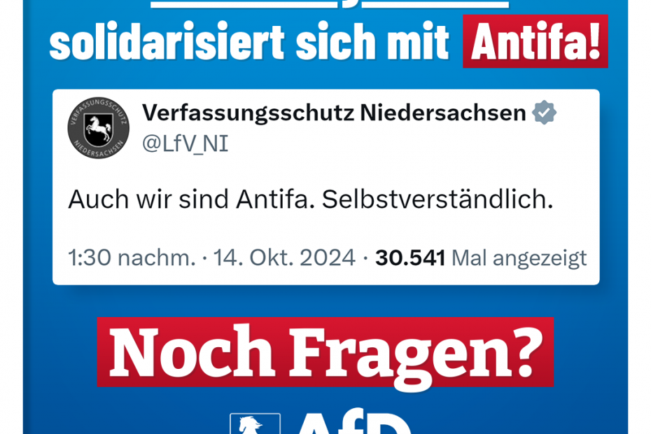 „Siamo tutti antifascisti!” schreibt der Verfassungsschutz von Niedersachsen am 14. Oktober auf X. (auf Deutsch: „Wir sind alle Antifaschisten!”) In dem Info-Tweet wird behauptet, dass es ‘die’ Antifa gar nicht gibt und sie als Organisation „nicht automatisch extremistisch“ sei. Spannend! In verständnisvoll klingenden Worten schreiben… Weiterlesen »Antifa und Verfassungsschutz: Wer war nochmal wer?