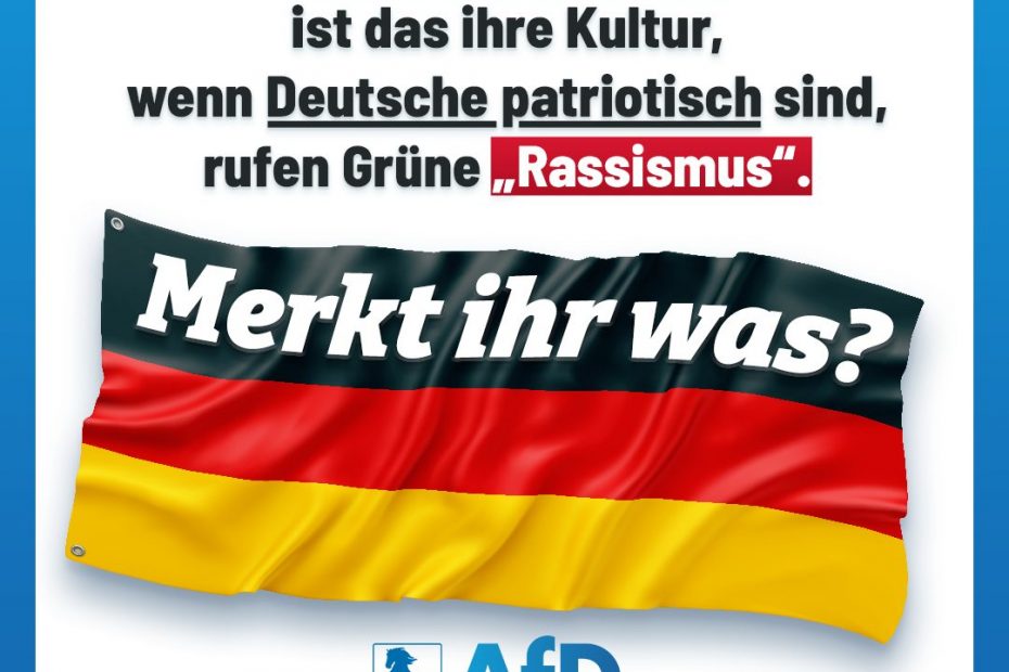 Grüne sind keine Moralapostel. Sie sind Doppelmoralapostel. Patriotismus bei Nichtdeutschen und vor allem Nichteuropäern ist laut den Grünen beeindruckend und inspirierend. Der Ukraine billigt man ihren Patriotismus ausnahmsweise zu, weil es dem Mainstream gerade in den Kram passt. Aber wenn wir Deutschen uns nur beim… Weiterlesen »Egal was Grüne sagen: Das sollten wir uns nicht nehmen lassen!
