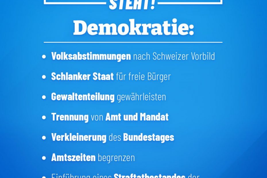 Die AfD stellt die Wei­ter­ent­wick­lung der Demo­kra­tie, hin zu noch mehr Volks­be­tei­li­gung und Mit­spra­che, ins Zen­trum ihres Pro­gramms. Das hat einen guten Grund: Wir glau­ben, dass die Demo­kra­tien von mor­gen mehr auf die Bür­ger hören müs­sen, nicht weni­ger! Durch Volks­ab­stim­mun­gen könn­te sich das Volk in wich­ti­gen Fra­gen Gehör ver­schaf­fen. Die Gewal­ten­tei­lung und die Tren­nung von Amt und Man­dat wol­len wir stär­ken, die Ver­flech­tung von Poli­tik, Rund­funk­rä­ten und Gerich­ten auf­lö­sen. Vom poli­ti­schen Geg­ner als „demo­kra­tie­feind­lich“ bezeich­net zu wer­den, obwohl man expli­zit mehr Demo­kra­tie for­dert und noch dazu den Bun­des­tag ver­klei­nern, Amts­zei­ten begren­zen und sogar Steu­er­ver­schwen­dung bestra­fen will, grenzt an Sati­re. Mehr Demo­kra­tie wagen? Das geht nur mit der AfD! Jetzt Unter­stüt­zer wer­den: www.afd-kommunalpolitik.de/kommunalwahl-niedersachsen