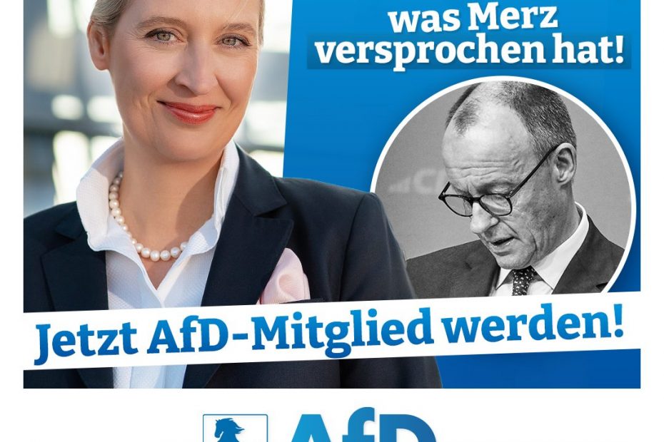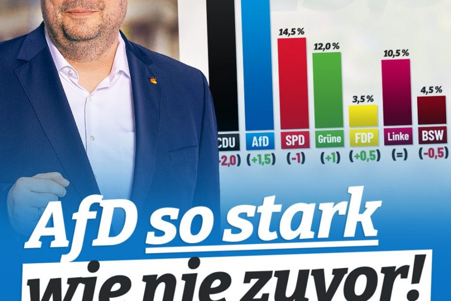 Mit 23,5 % erreicht unse­re AfD ihr bis­her stärks­tes bun­des­wei­tes Umfra­ge­er­geb­nis – und rückt damit emp­find­lich nah an die Uni­on her­an. Die Bür­ger spü­ren, dass eine Zei­ten­wen­de nötig ist: weg von Mas­sen­ein­wan­de­rung, Kli­­ma-Irr­­sinn und wirt­schaft­li­cher Selbst­zer­stö­rung – hin zu Ver­nunft, Sicher­heit und Wohl­stand! „CDU und… Wei­ter­le­sen »Neu­er Zustim­mungs­re­kord für die AfD!