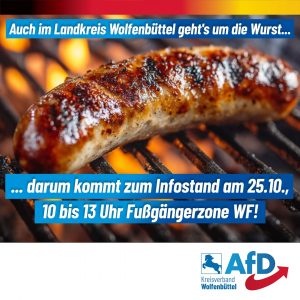 Von 10 bis 13 Uhr finden uns interessierte Mitbürger am Samstag, den 25.10.2025, im Bereich Löwentor der Wolfenbütteler Innenstadt. Dort können sich unsere Gäste, bei Gesprächen mit ihren Vertretern aus der Kommunal‑, Landes- und Bundespolitik, mit kostenloser Bratwurst stärken.