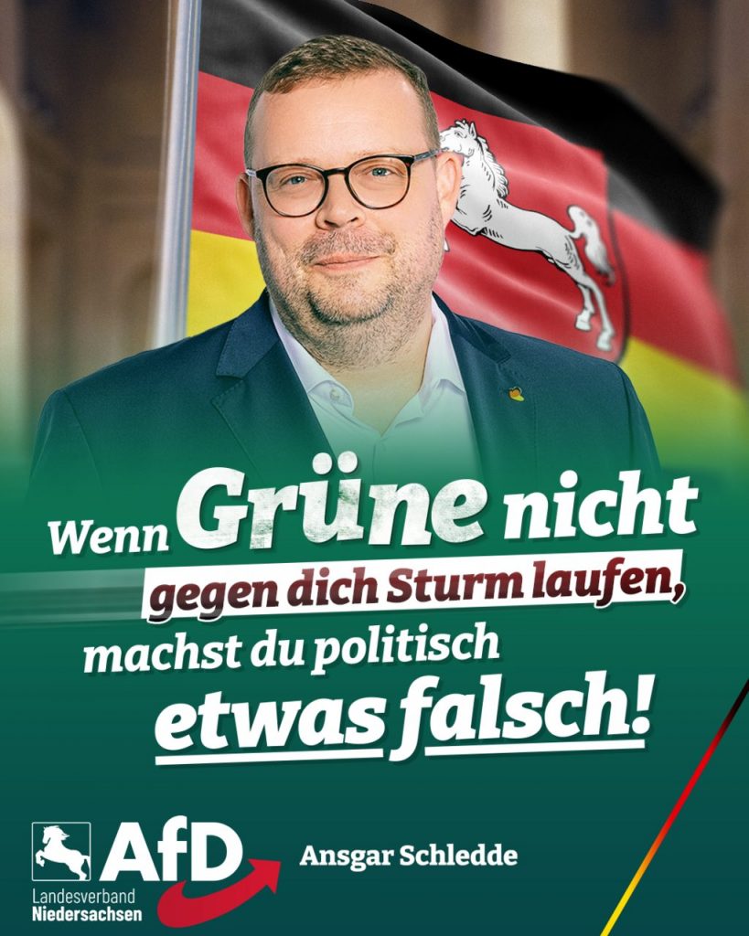 „Die Grünen und ihre Wählerschaft bilden ein von der Realität abgekoppeltes Milieu“, meint Schledde und warnt: „Von der Regierung sollte dieses Milieu aus Gratismutigen und Gutmenschen ferngehalten werden.“ Für die Kommunalwahl in Niedersachsen im kommenden Jahr gelte deshalb: „Wähle immer so, dass ein Grüner was dagegen hätte!“