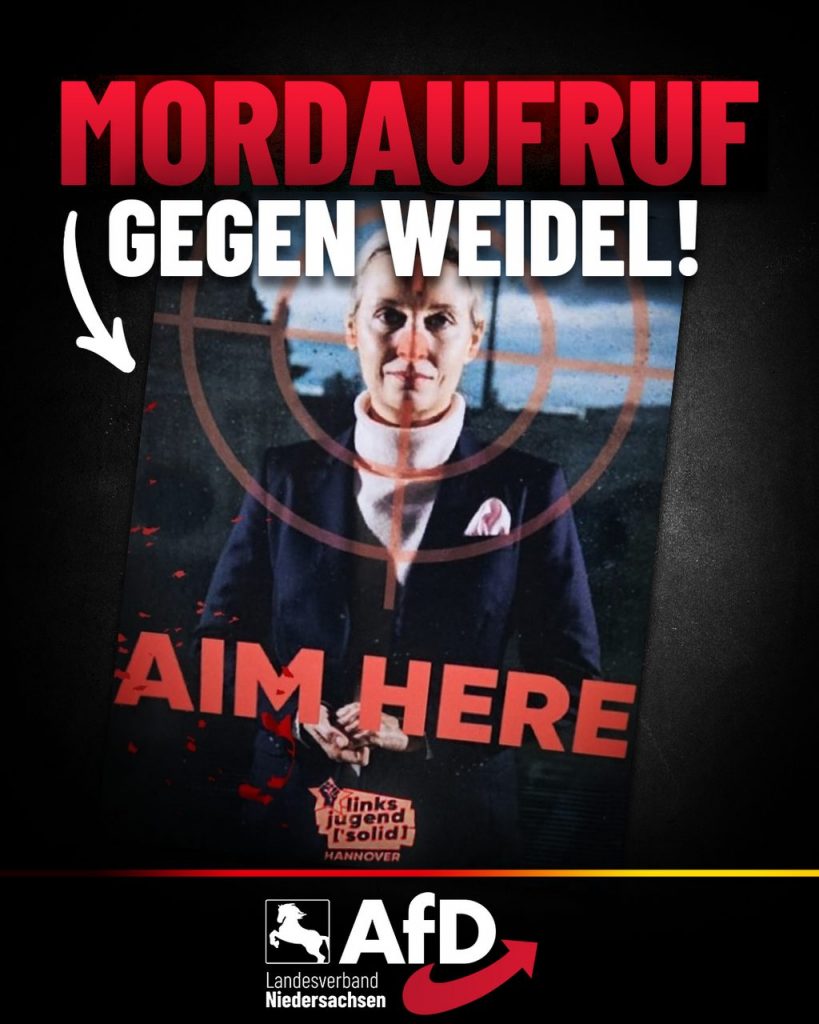 Die Jugendorganisation der Linken in Hannover wird gerade mit Strafanzeigen eingedeckt, weil sie unsere Parteichefin Alice Weidel auf einem Aufkleber verewigt haben sollen – mit Fadenkreuz auf ihrem Gesicht und dem Spruch „Aim here“ – „zielt hierauf“. Noch deutlicher kann man nicht zum Mord aufrufen.