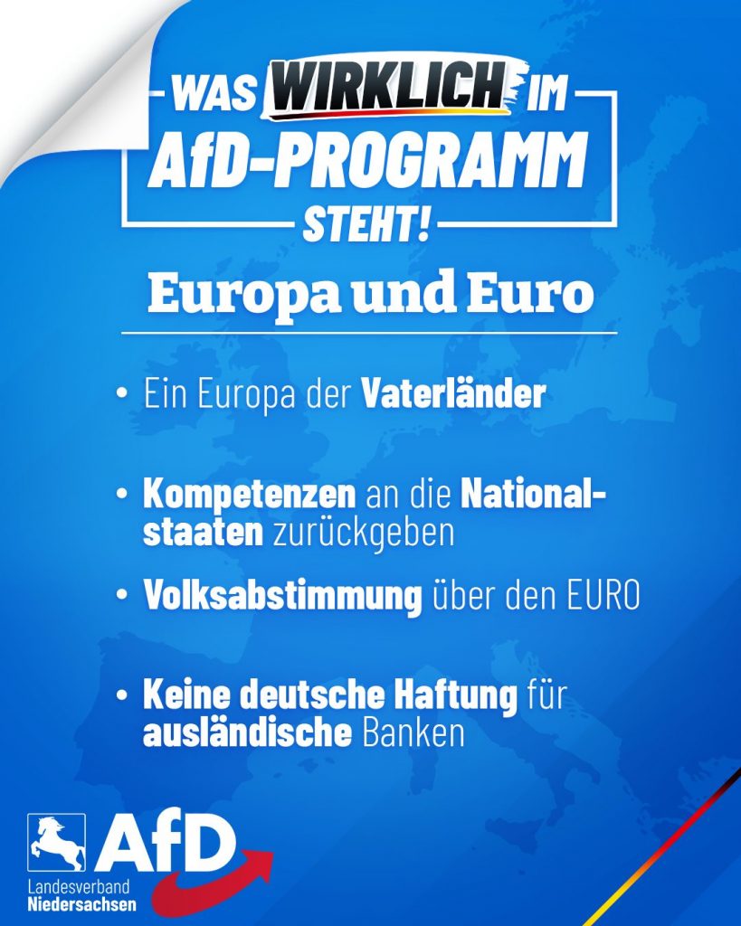 Die AfD setzt sich für eine Europapolitik ein, die nicht auf die Zentralisierung der Macht in Brüssel und die Abschaffung nationaler Souveränität hinausläuft. Wir wollen ein Europa der Vaterländer, in dem die europäische Idee und die Freiheit auf unserem Kontinent überleben können!